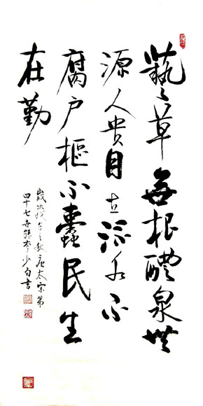 李少白,北京人,原名李伦,唐太宗第四十七世孙, 七十年代生于书香世家。精翰墨、工诗文、喜金石。他自幼酷爱书法:揩书临于颜、赵,行书取法于王羲之、黄庭坚和米芾; 草书取法于张旭、孙过庭及贺知章。作品多次参加国内外各类书画展,获得“著名书法家”等荣誉称号。其作品被多位国家领导人收藏。